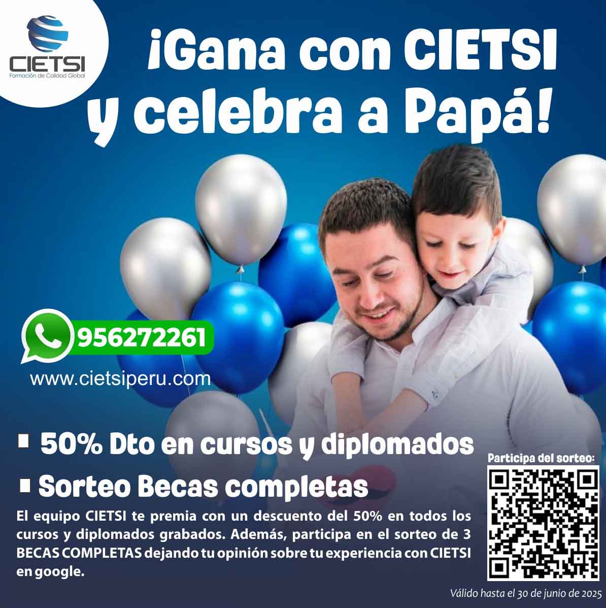 Realizado el pago comunicarse con nosotros enviando un email a informes@cietsiperu.com, con los siguientes datos (nombres completos, DNI, teléfono/celular, asunto: PROMOCIÓN POR DÍA DEL PADRE), adjuntando el comprobante de pago, luego de validar nos comunicaremos con usted a la brevedad.