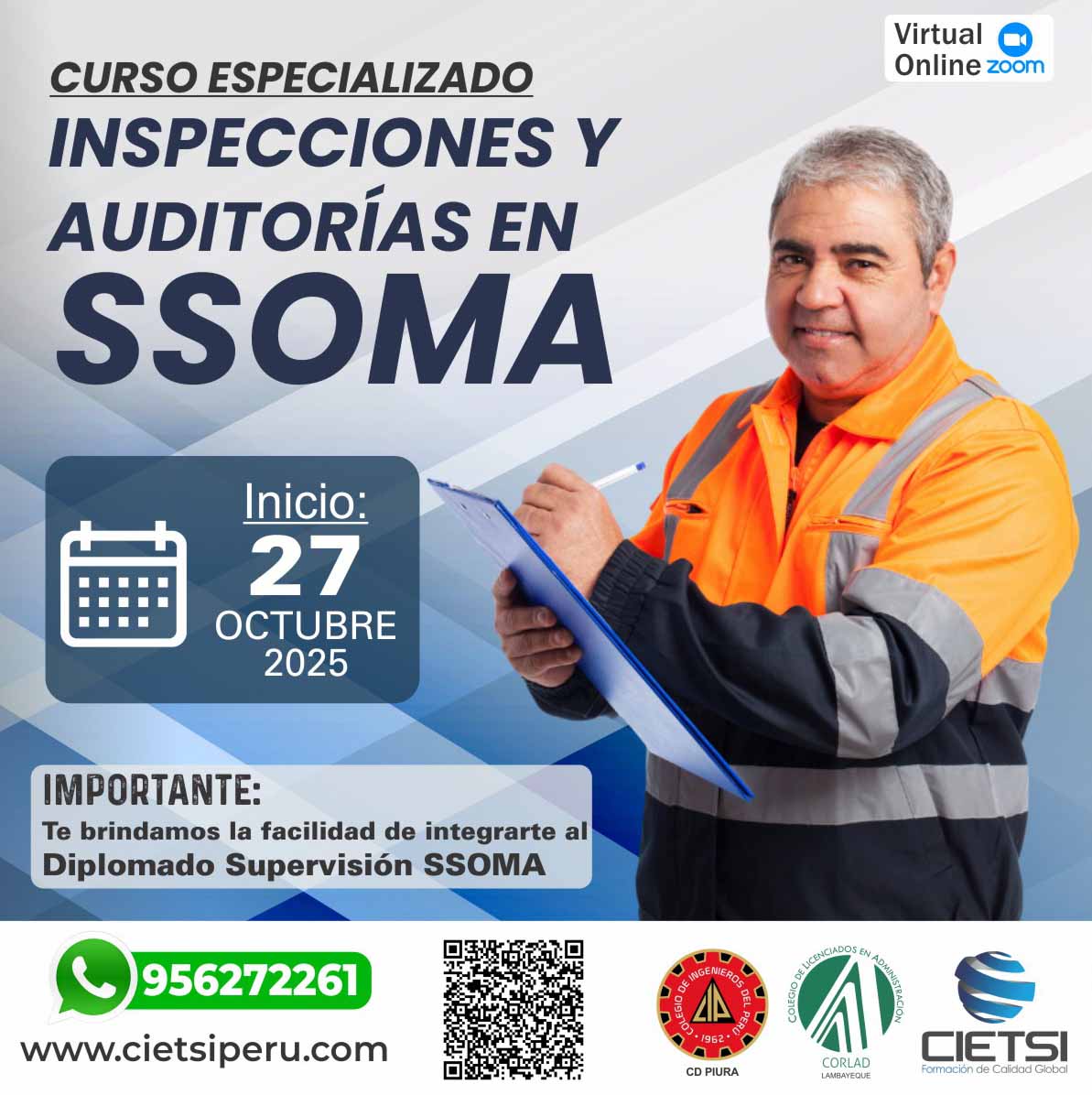+ Te brindamos la oportunidad de integrarte al Diplomado de Especialización en Supervisión de Seguridad, Salud Ocupacional y Medio Ambiente (SSOMA) con opciones de certificación con la Universidad Nacional de Trujillo, Colegio de Ingenieros del Perú CD Piura, Colegio de Licenciados en Administración Región Lambayeque o CIETSI.