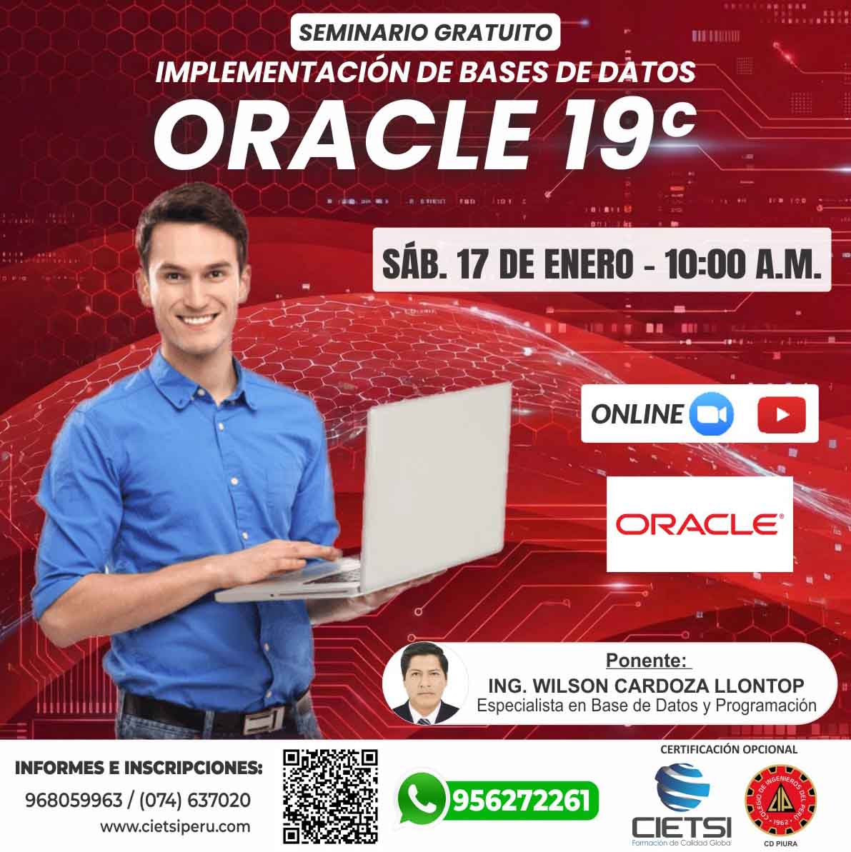 + En este evento brindaremos promociones para la certificación del próximo PROGRAMA GRATUITO DE ESPECIALIZACIÓN EN IMPLEMENTACIÓN Y ADMINISTRACIÓN DE BASE DE DATOS CON ORACLE 19c (Con inicio 17 de febrero de 2026).