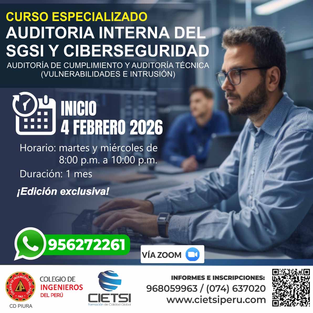 + Te brindamos la oportunidad de integrarte al Diplomado de Especialización en Ciberseguridad, Seguridad de la Información, Gestión de Riesgos y Auditoría con opciones de certificación con la Universidad Nacional de Trujillo, Colegio de Ingenieros del Perú CD Piura y CIETSI.