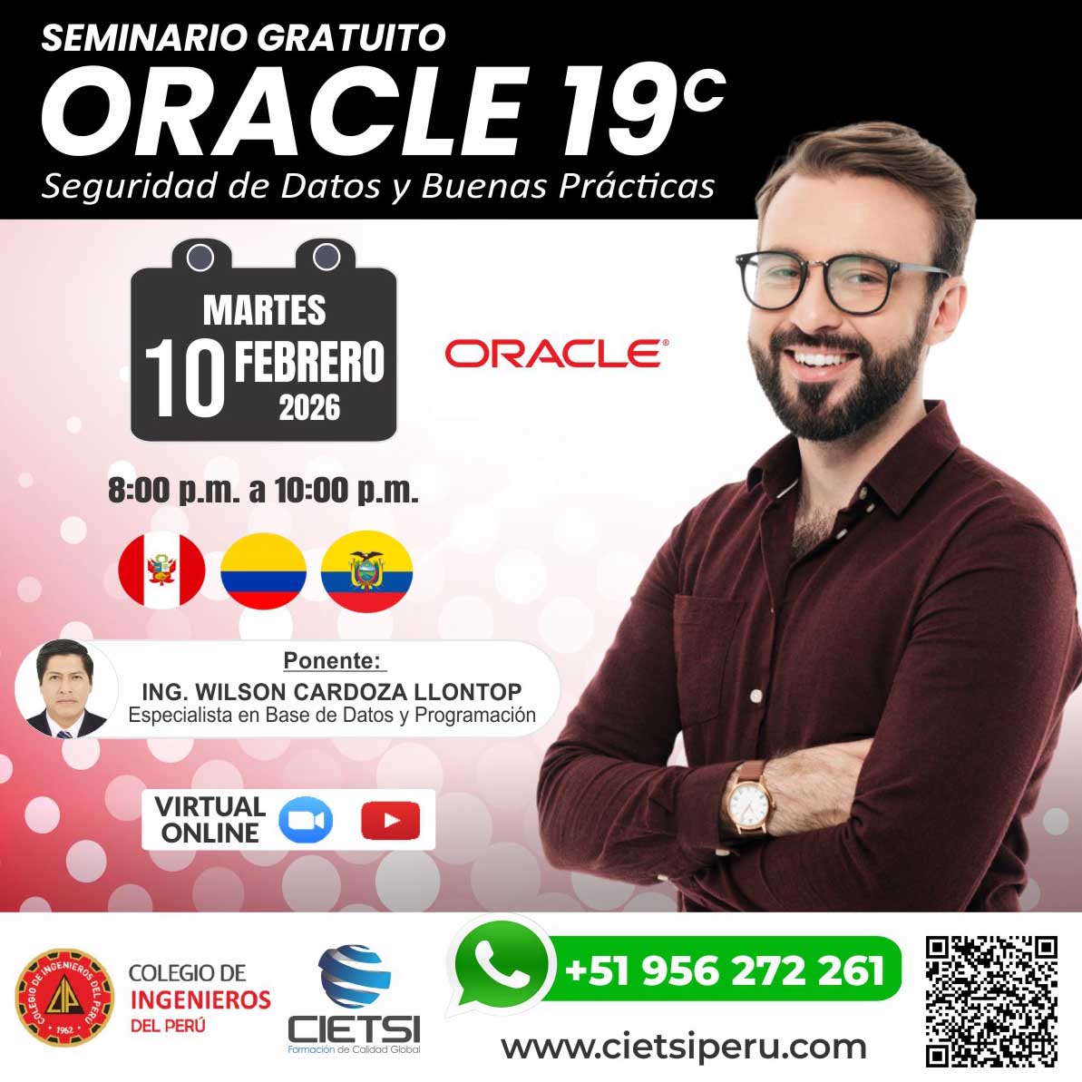 + Realizado el pago comunicarse con nosotros enviando un email a informes@cietsiperu.com o al WhatsApp: 956272261 o 968059963, con los siguientes datos (nombres completos, DNI, teléfono/celular, asunto: CERTIFICADO SEMINARIO GRATUITO ORACLE 19C “Seguridad de Datos y Buenas Prácticas”, adjuntando el comprobante de pago), luego de validar nos comunicaremos con usted a la brevedad.